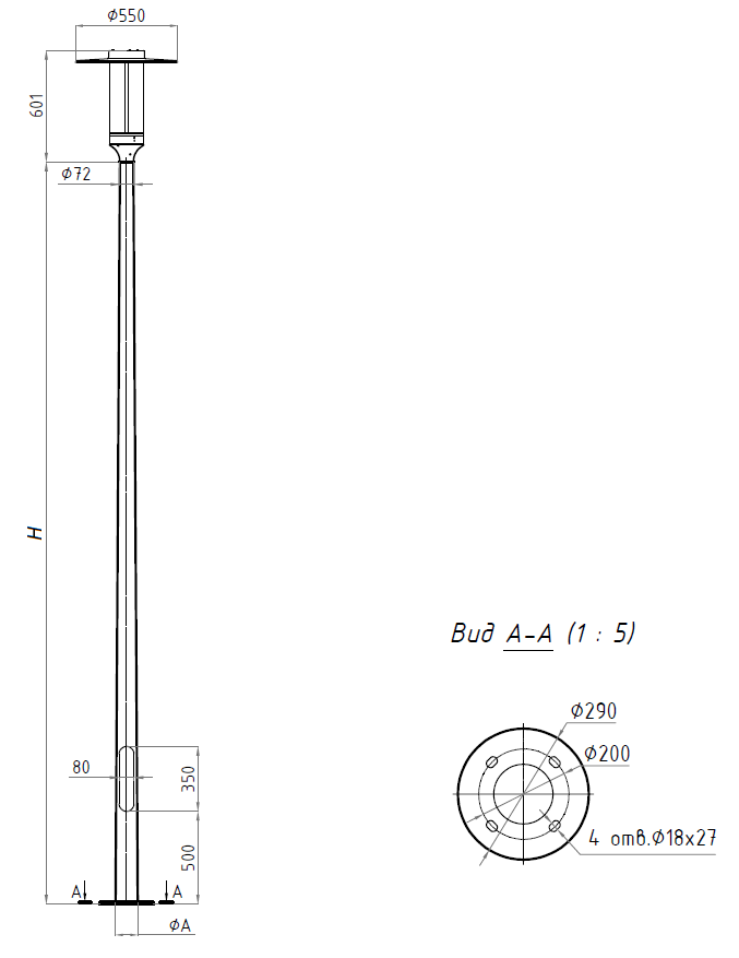 Опора устанавливается на заранее забетонированную закладную деталь посредством фланцевого соединения. Подвод подземного кабеля через специальное окно в закладной, подключение светильника через люк на опоре.