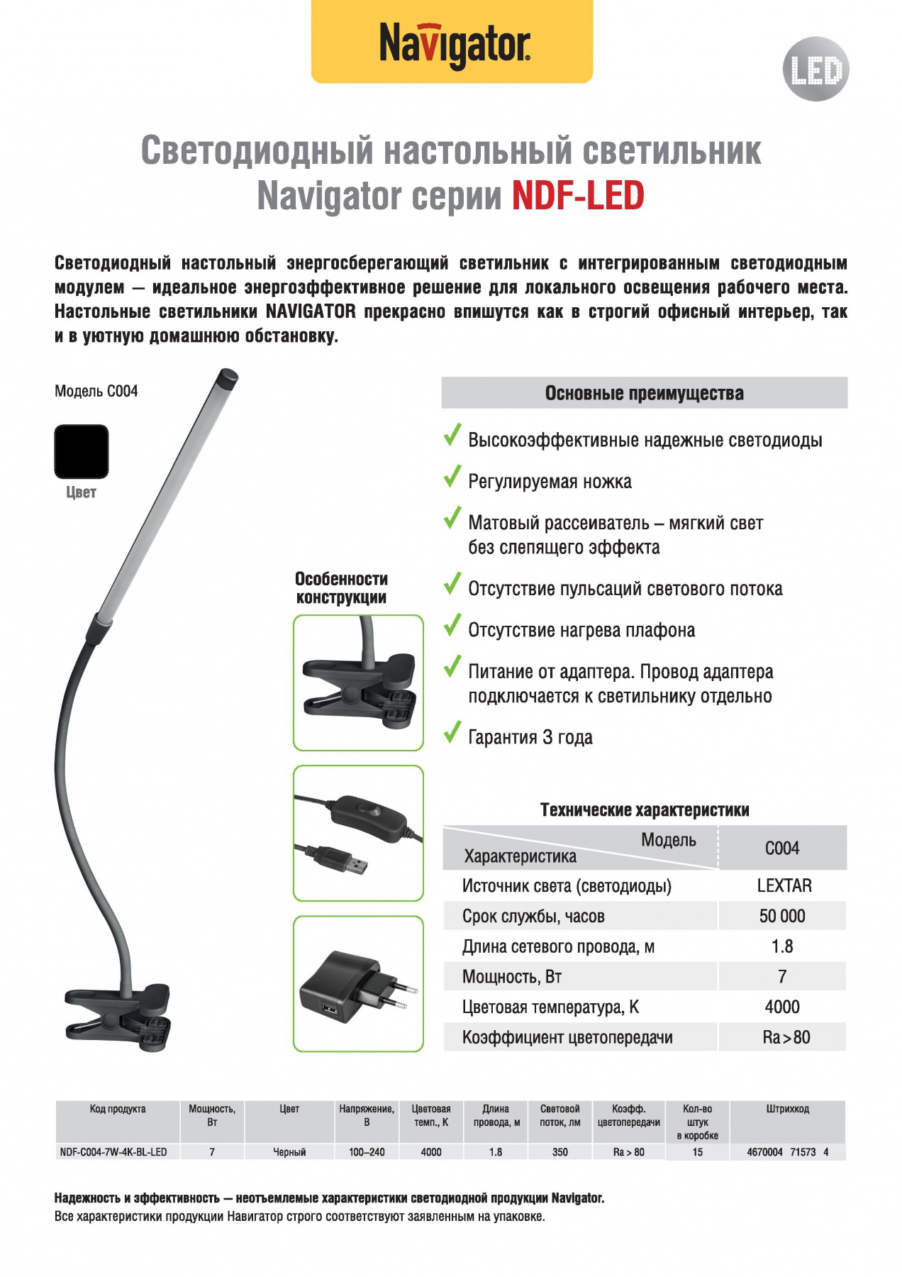 Светильник Navigator 94 989 NDF-D004-7W-4K-G-LED на осн. USBвых., димм, зел