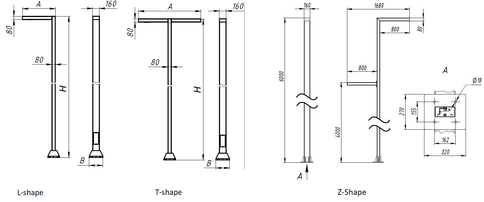 Закладная часть устанавливается в землю, опора со светильником крепится к закладной фланцевым способом. Подвод подземного кабеля через специальное окно в закладной, подключение светильника через люк на опоре.