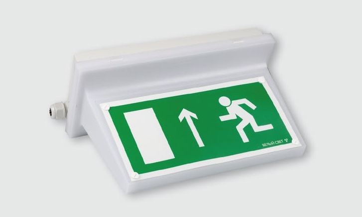 Светодиодный указатель выхода IP65. Светильник устанавливается на поверхность стены/потолка. Дистанция распорзнавания указателя - 30 метров.