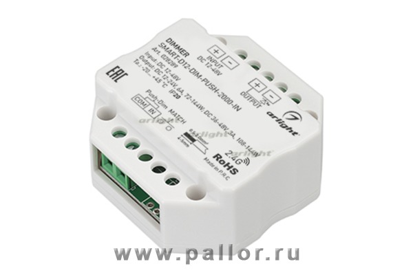 Описание Диммер SMART-D12-DIM-PUSH-2000-IN (12-48V, 1x6A, 2.4G) (Arlight, IP20 Пластик, 5 лет)