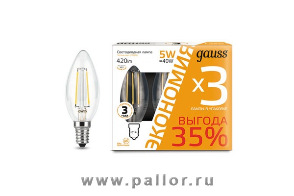 | Лампа Gauss Filament Свеча E14 5W 420lm 2700К 1/20 (3 лампы в упаковке) | 103801105T | 5 | (E14) | По запросу |