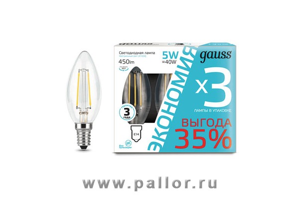 | Лампа Gauss Filament Свеча E14 5W 450lm 4100К 1/20 (3 лампы в упаковке) | 103801205T | 5 | (E14) | По запросу |