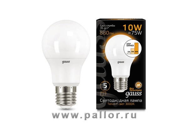 Описание Лампа Gauss LED A60 10W E27 880lm 2700K step dimmable 1/10/50