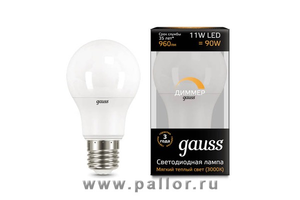 Описание Лампа Gauss LED A60-dim E27 11W 960lm 3000К диммируемая 1/10/50