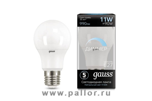 Описание Лампа Gauss LED A60-dim E27 11W 990lm 4100К диммируемая 1/10/50