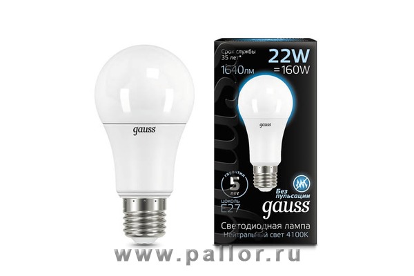Описание Лампа Gauss LED A70 22W E27 1640lm 4100K 1/10/50