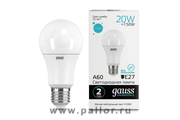 Описание Лампа Gauss LED Elementary A60 20W E27 1600lm 4100K 1/10/50