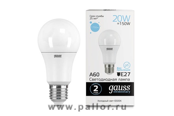 Описание Лампа Gauss LED Elementary A60 20W E27 1750lm 6500K 1/10/40