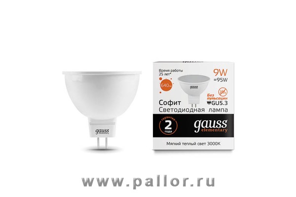 | Gauss LED Elementary MR16 GU5.3 9W 3000K | 13519 | 9 | (GU5.3) | 50х50 |