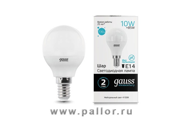 Описание Лампа Gauss LED Elementary Шар 10W E14 920lm 4100K 1/10/100