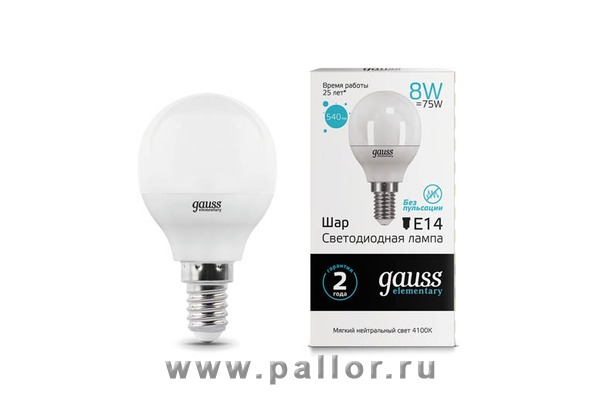 Описание Лампа Gauss LED Elementary Шар 8W E14 540lm 4100K 1/10/100