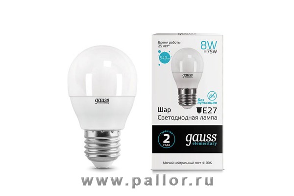 Описание Лампа Gauss LED Elementary Шар 8W E27 540lm 4100K 1/10/100