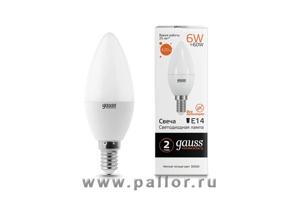 Описание Лампа Gauss LED Elementary Свеча 6W E14 420lm 3000K 1/10/100