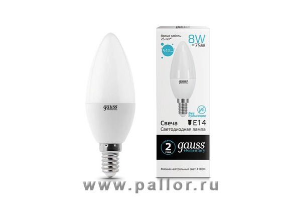 Описание Лампа Gauss LED Elementary Свеча 8W E14 540lm 4100K 1/10/100