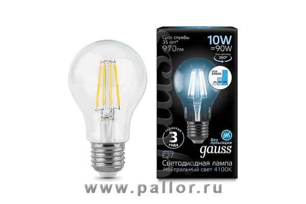 Описание Лампа Gauss LED Filament A60 E27 10W 970lm 4100К step dimmable 1/10/40