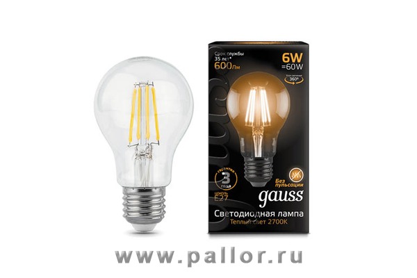 Описание Лампа Gauss LED Filament A60 E27 6W 600lm 2700К 1/10/40