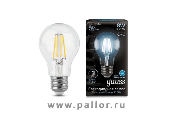 Описание Лампа Gauss LED Filament A60 E27 8W 780lm 4100К 1/10/40
