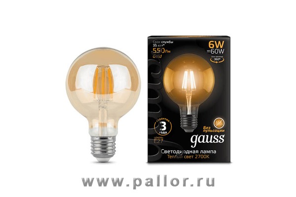 Описание Лампа Gauss LED Filament G95 E27 6W Golden 550lm 2400K 1/20