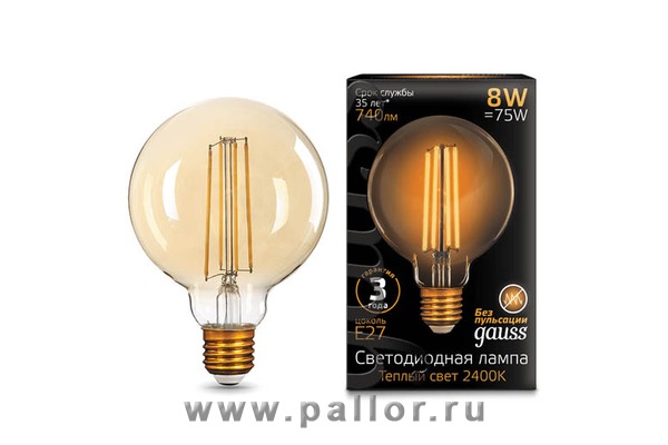 Описание Лампа Gauss LED Filament G95 E27 8W Golden 740lm 2400К 1/20