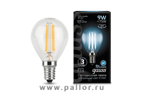 Описание Лампа Gauss LED Filament Шар E14 9W 710lm 4100K 1/10/50