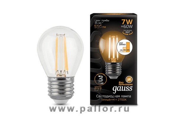 | Лампа Gauss LED Filament Шар E27 7W 550lm 2700K step dimmable 1/10/50 | 105802107-S | 7 | (E27) | По запросу |