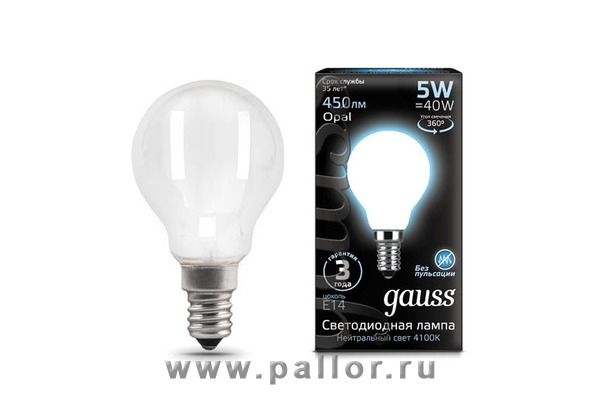 | Лампа Gauss LED Filament Шар OPAL E14 5W 450lm 4100K 1/10/50 | 105201205 | 5 | (E14) | По запросу |