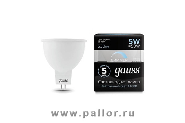Описание Лампа Gauss LED MR16 GU5.3-dim 5W 530lm 4100K диммируемая 1/10/100