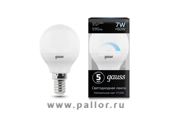 Описание Лампа Gauss LED Шар-dim E14 7W 590lm 4100К диммируемая 1/10/100
