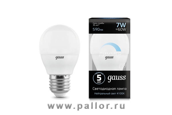 Описание Лампа Gauss LED Шар-dim E27 7W 590lm 4100К диммируемая 1/10/100