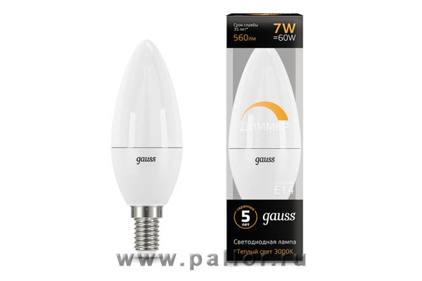 Описание Лампа Gauss LED Свеча-dim E14 7W 560lm 3000К диммируемая 1/10/100