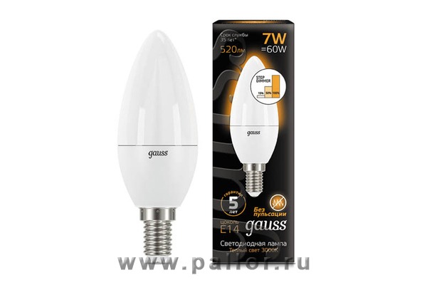 Описание Лампа Gauss LED Свеча E14 7W 520lm 3000К step dimmable 1/10/100