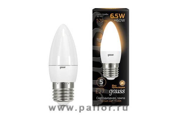 Описание Лампа Gauss LED Свеча E27 6.5W 520lm 2700К 1/10/100