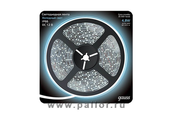 Описание Лента LED 2835/60-SMD 4.8W 12V DC холодный белый IP66 (блистер 5м)