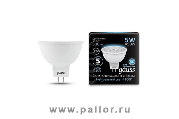 Описание Лампа Gauss LED MR16 GU5.3 5W 12V 530lm 4100K 1/10/100