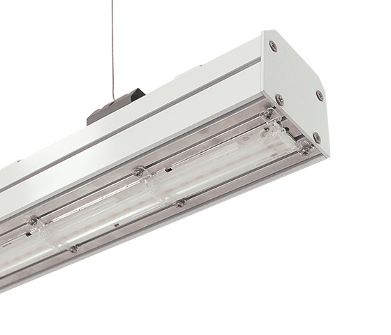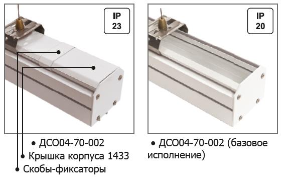 Оптическая часть: опаловый рассеиватель или вторичная оптика в виде линз с различными типами КСС. Степень защиты IP20 или IP23. Степень защиты IP23 достигается путем установки на корпус светильника крышки, зафиксированной специальной скобой.