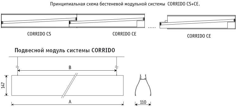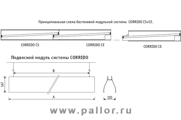 Комплект состоит минимум их двух модулей: CORRIDO CS, CORRIDO CE. CORRIDO CS — стартовый модуль. CORRIDO CE — основной модуль, из которого формируется линия. Соединительные элементы входят в комплект поставки.