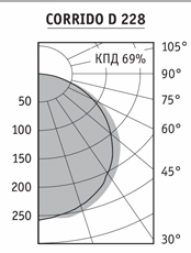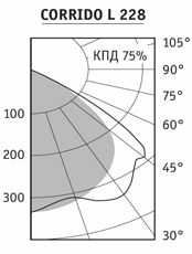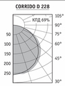 : CORRIDO D — опаловый рассеиватель из полимерного материала. CORRIDO L — зеркальная бипараболическая решетка из алюминия марки MIRO.Габаритные характеристики и КСС светильника