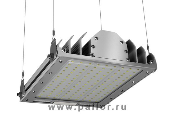 Уличный светодиодный промышленный светильник подвесного типа. Размещается на тросовом подвесе или цепях. Конструкция светильника предусматривает продольную регулировку крепежа.