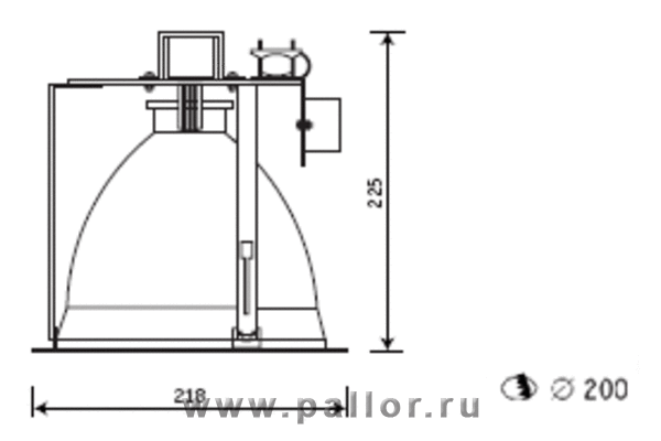 Зеркальный отражатель в окрашенном кольце. Выносной бокс с пускорегулирующей аппаратурой электрически связан с корпусом светильника.