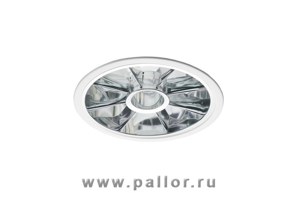 Оптическая часть - отражатель из зеркального алюминия, зеркальная решетка "турбо". Белое декоративное кольцо. Горизонтальное расположение ламп.
