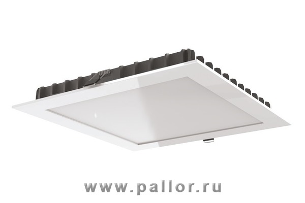 Встраиваемый светодиодный светильник типа Downlight/направленного света для монтажа в потолки из гипсокартона (прижимная системакрепления) и ячейки Грильято, кратные 50 (отверстия для подвесов имеются в корпусе светильника). Установочные размеры 185х185 мм.