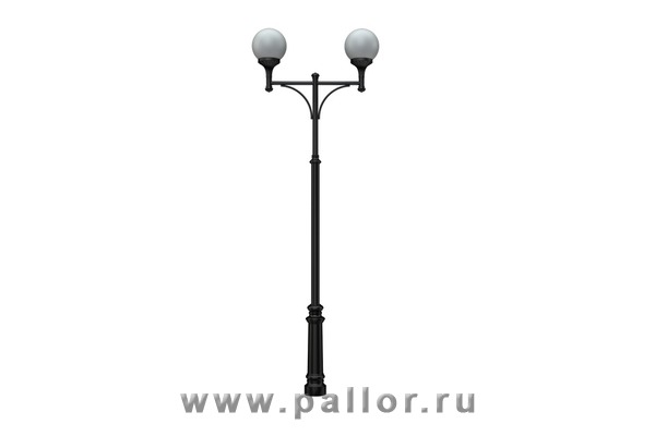 Опора выполнена из стальных труб, декорирована чугунными и стальными элементами (переходниками, основаниями, тумбами). В цокольной части опоры находится ревизионное окно (лючок) для установки выключателей и клеммных блоков. Закладная деталь фундамента входит в комплект опоры. Светильники приобретаются отдельно.