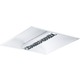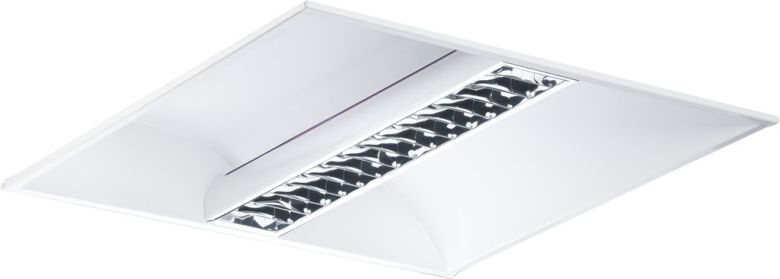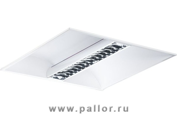 Бипараболическая решетка встраиваемого энергосберегающего светильника сделана из матированного алюминия марки MIRO и боковые параболические отражатели, покрытые белой матовой краской.