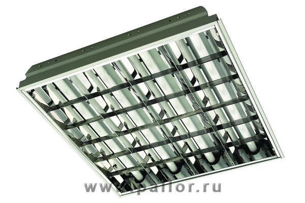 Оптическая часть - сборный растр из зеркального алюминия «Alanod» классической V-образной формы с 5-ю ребристыми поперечинами. Ламподержатели закрыты боковыми слотами.