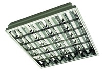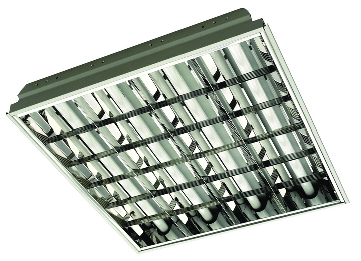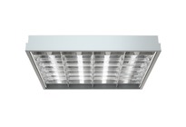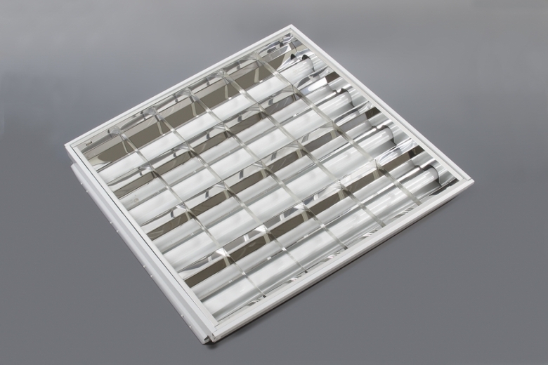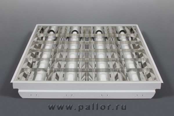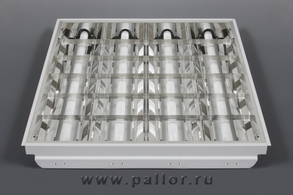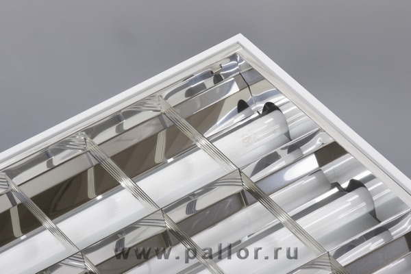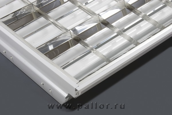 Оптическая часть - сборный растр из зеркального алюминия «Alanod» классической V-образной формы с 5-ю ребристыми поперечинами. Ламподержатели закрыты боковыми слотами.